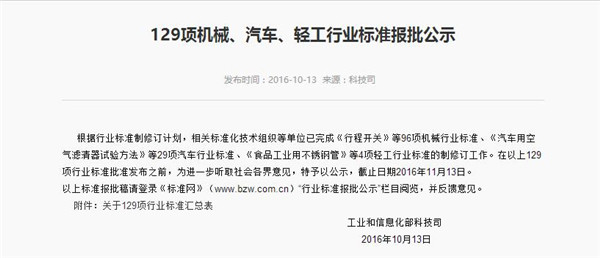 10月13日,工業和信息化部科技司對129項機械、汽車、輕工行業標準進行報批公示。其中涉及到電動汽車行業標準的有兩項,標準名稱分別為《電動汽車用異步驅動電機系統》、《電動汽車用永磁同步驅動電機系統》。