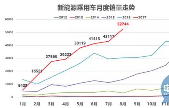 據(jù)乘聯(lián)會的數(shù)據(jù),2017年8月新能源乘用車銷量創(chuàng)有史以來單月銷量新高,達(dá)到52744臺,環(huán)比7月增長1萬臺,同比增速72%。